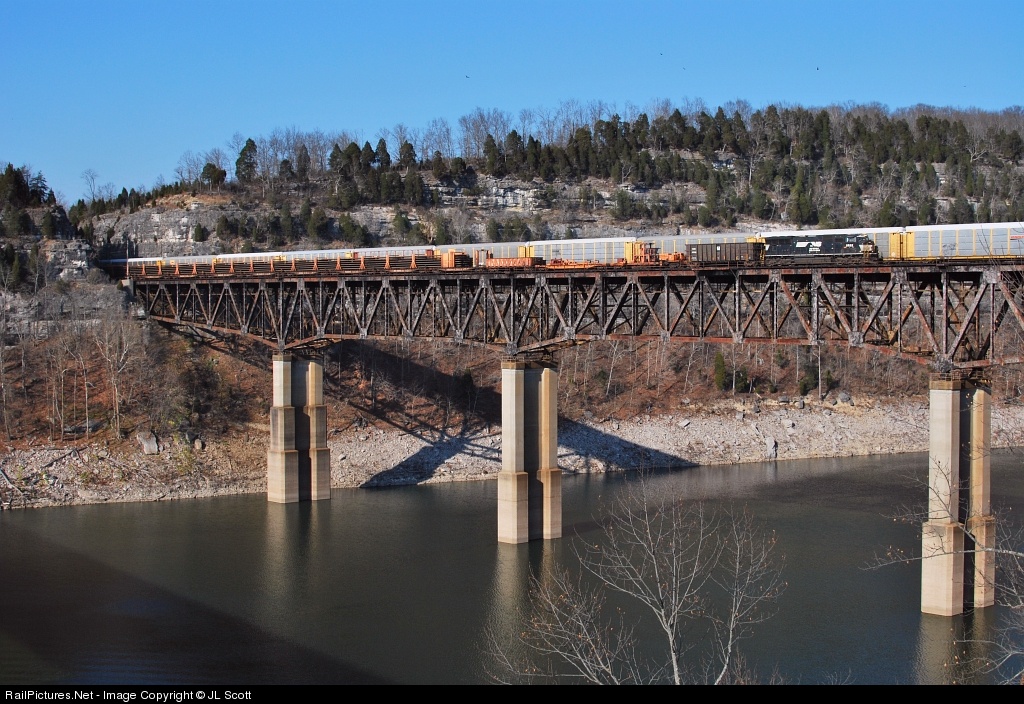 A southbound rail train meets a northbound rack train (NS 27W) on the Cumberland River bridge.