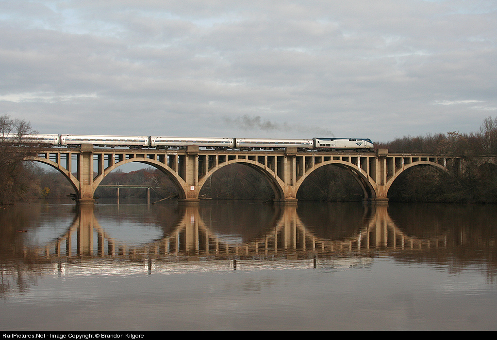 A northbound Northeast Reginal train rolls over the Rapahannock River on it's way to Washington DC and beyond after departing the station in Fredericksburg Virginia.