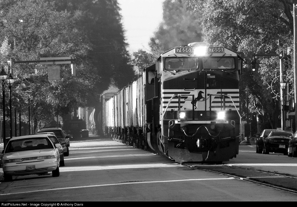 | Augusta Street Running Action in Black & White! A Late NS 156 heads North up Augusta's Semi-Famous 6th Street on its way to its terminating point of Linwood, North Carolina. I've always wanted to attempt a Black & White shot and figured for this street running shot I would do it. Personally the Black & White setting on this particular street running shot gives it "the feel" of the train really standing out in the middle of the street! |