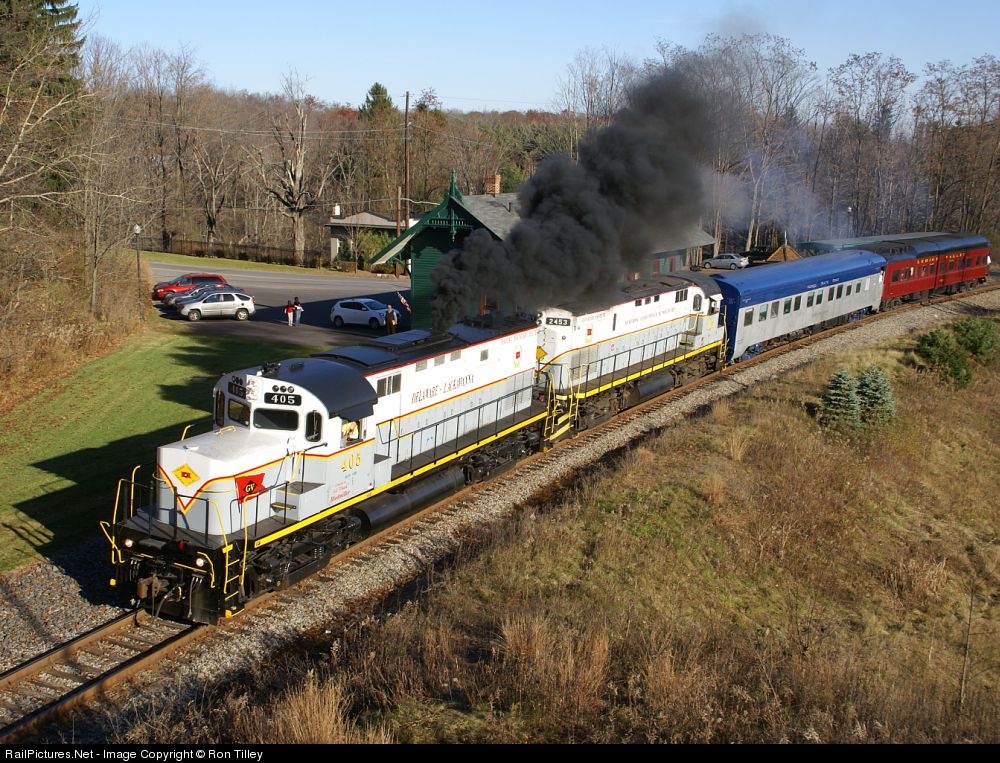 | A special trip chartered by the Erie Lackawanna Dining Car Preservation Society is on its last leg of its journey from Scranton to East Stroudsburg and return. DL 405, and MHWA 2453 smoke it up after making a stop at the Cresco station. |