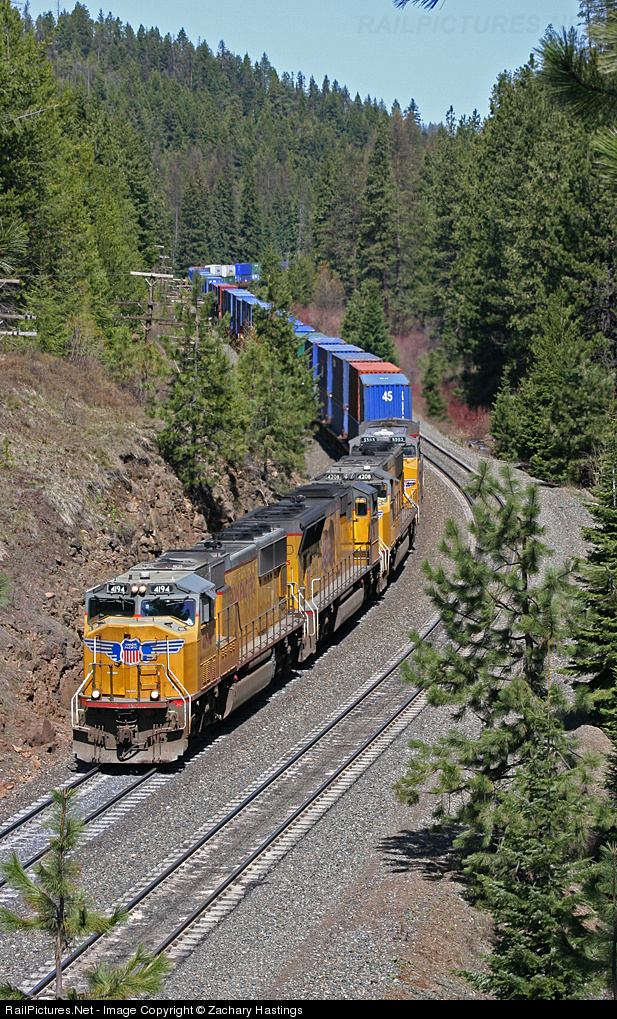 | UP #4194 leads three more big UP road units at Montanic siding in the middle of a descent from the top of the hill at Kamela to La Grande.. This is the La Grande Subdivision that covers the Blue Mountains that is the first obsticle in the way for this stack train from the PNW ports to Midwest destinations. Climbing over the Blues have some major obsticles including curves, grades and meets with other trains on this particular subdivision.. |