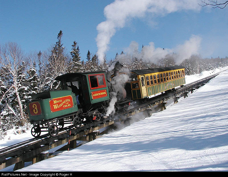| In 2005 and 2006 the cog railway operated a ski train part way up Mt. Washington. Skiers would ride the cog up to Waumbek tank (about 1/3 the way up the mountain), then ski down beside the tracks.