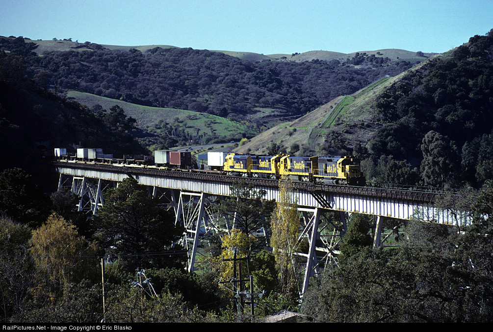 Santa Fe SD40 5000 leads an eastbound intermodal train over the Alhambra Creek trestle in Franklin Canyon.
