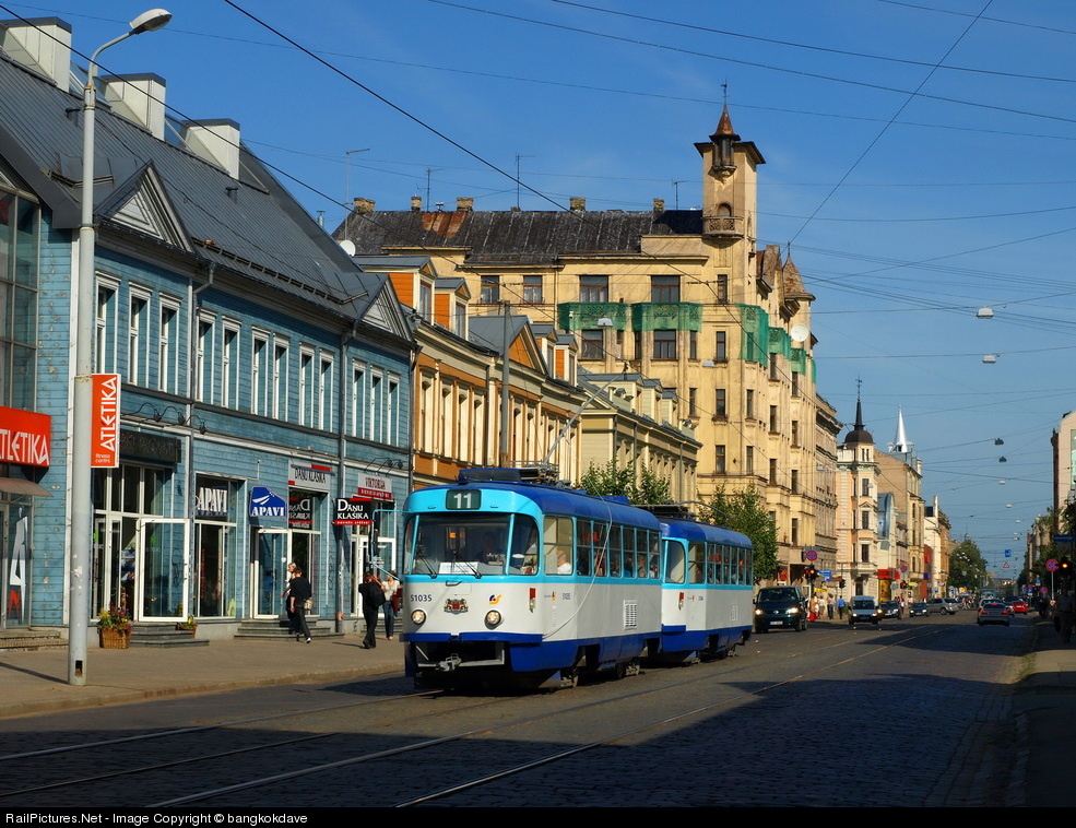 The No. 11 is heading down Kr. Barona street, a place rich with turn-of-the-century buildings constructed in Art Nouveau (or Jugenstill) style, exemplified by the building with a small tower in the background. Riga's many remaining wooden houses, like the ones the tram is passing, can be seen here as well.