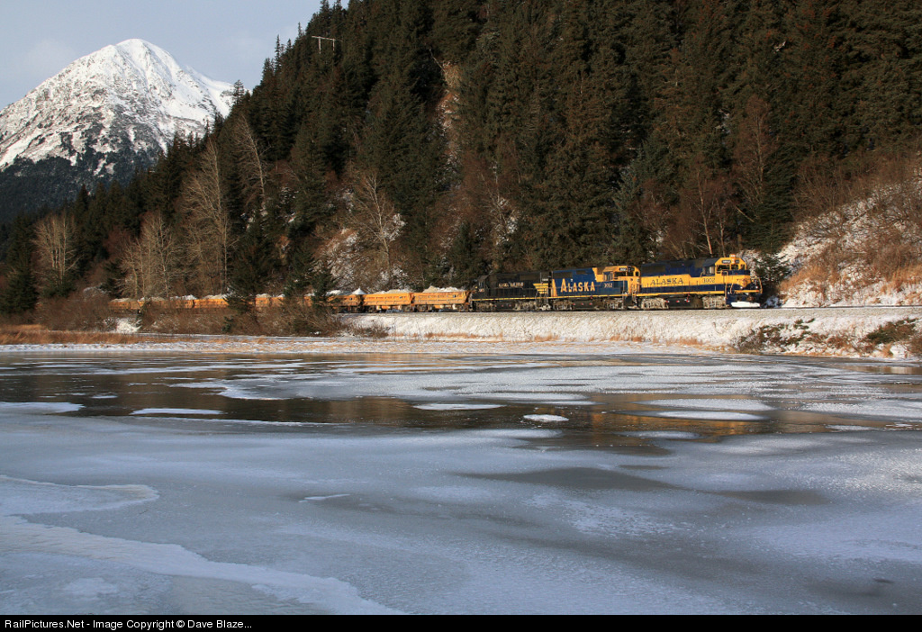 Three GP40-2s (3002, 3012, 3008) each wearing a unique paint scheme in descending order from most recent to most vintage lead a work train south along Turnagain Arm on a cold blustery Saturday. The lead unit wears the to the sophisticated scheme of today debuted in the 1990s on the SD70MACs and now the ARR's standard, while the second is adorned in the bold blue and yellow of 1980s and State ownership, and the third is dressed in the austere black and gold of the mid 1970s Federal days.