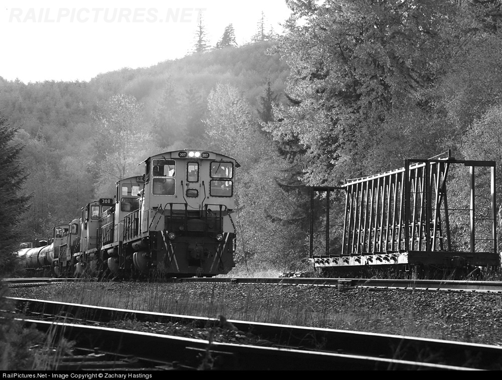| Weyerhaeuser #307 is in charge of the downhill Landfill train that is passing the 'old' Headquarter shops at MP 15.25. The Landfill train has just switched cars to take back down the grade to the Longview Mill. The 'new' Headquarter shops are 1/4 of mile to the west of this photo and are shared with the MOW people now based there.. The crew insists that the 307 has great visiblity, a well working cab heater & lots of space compared to the other SW1500's Weyerhaeuser has working currently. The centerbeam to the right was involved in an accident when the engineer acclerlated the train too hard when the train exited the only tunnel on the line back in the early 1980's.. This was a Weyerhaeuser Woods train going from the Longview mill to the Green Mountain Mill which closed on May 1st, 2008.. On the far end of the draft gear, you will see no coupler or drawbar as it has been sitting up at the 'old' shops for all these years since the accident.. That car is the only remaining Weyerhaeuser 50 foot lumber centerbeam car left on the railroad currently. All of the Weyerhaeuser cars that used to carry wood products have been scrapped as well as the Green Mountain Mill. Weyerhaeuser railroad has ended the life of a logging railroad as of May 1st of last year. |