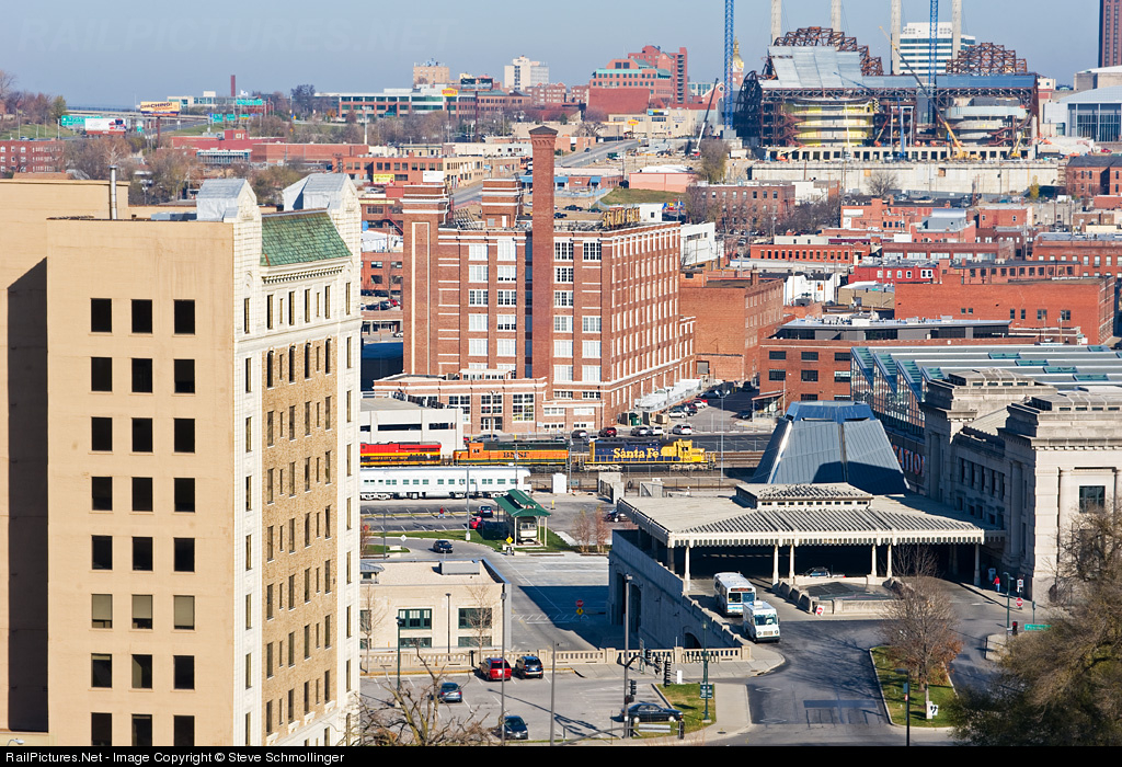BNSF 6716 East passes Union Station with the Kauffman Center for the Performing Arts under construction in the distance.