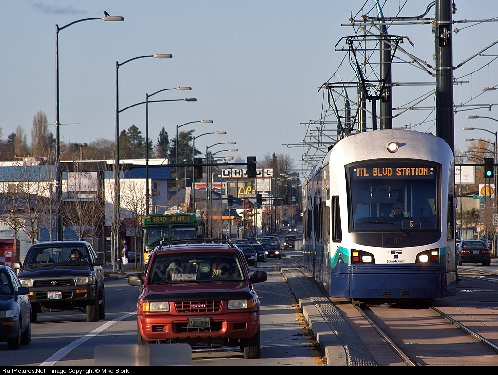 Under a clutter of catenary, a two car Link Light Rail train rolls along MLK Way. Each 2-car train can carry 400 passengers. That's equivalent to 354 cars or 10 articulated buses. In this shot are only a handful of cars and one articulated bus. On the mid-day train, there aren't 400 people on board, but there are still 100 or so traveling up and down the Link on the 2-car set. Each lane of traffic can ideally move 1000 vehicles/hour, or 1130 people/hour. One "lane" of Link Light Rail can move 12,000 people/hour. (Numbers based off ST estimates.) All the math aside, the new line has already attracted a fair number of riders, and plenty of new transit-orientated development along the line.