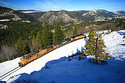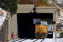 For some unknown reason, DS74 has lined a 13,417 ton grain train onto the #2 track, to run wrong main down the pass.. UP 6472 is one of 8 GE AC4400CW's, and pokes it's yellow nose out of the tunnel at Switch 9 on a clear and cold day.