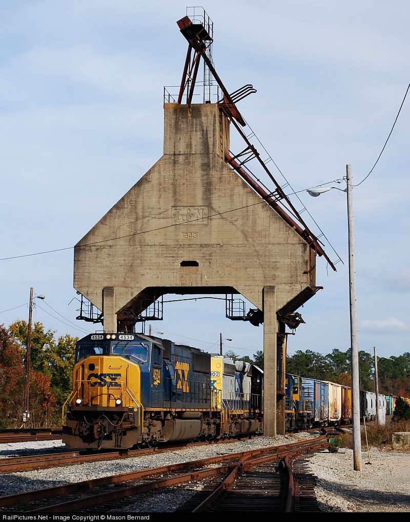 Q521 looks small compared to the massive L&N Coaling Tower that it is passing underneath. Notice the L&N logo and build year cast into the concrete.