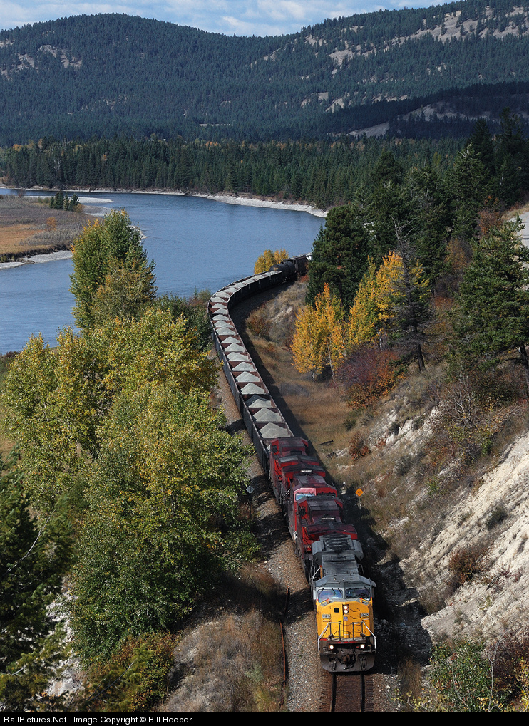 Eastbound train 268 UP-Eastport ID to Alyth(Calgary)AB rolls along the Kootenay River just East of Cranbrook BC. The Gravel in the head end hoppers are from a pit just west of Cranbrook