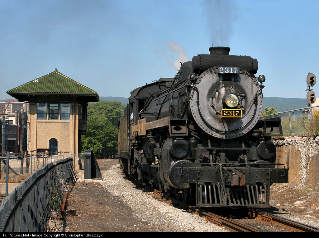 | Canadian Pacific 4-6-2 2317 storms upgrade out of Scranton with a full trainload headed into the Poconos. In reality, the Pacific spent the last few years relegated to yard duty, seen here leading two coaches past the restored former DL&W Mattes Street Tower. The signal at right was for trains leaving former Lackawanna station platform. |