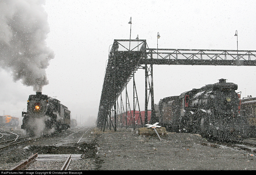 | Canadian Pacific spent what could be her last operating day shuffling a single coach through the Steamtown yard in the snow, seen here passing the bridge connecting the museum to the mall and a couple of preserved steamers, including CN 2-8-2 3377 and CP 4-4-4 2929. In the background, the stored CNJ F3s provide the only bright color in the photo. |
