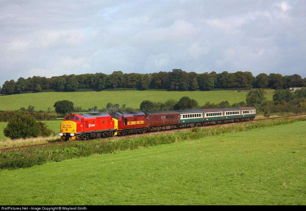 | 37670 and 37401 are seen south of Queen Camel in rural Somerset, with First Great Western's last summer loco hauled service to Weymouth in 2009. As a special treat these two locomotives were rostered rather than the usual top andtail Class 67s. |