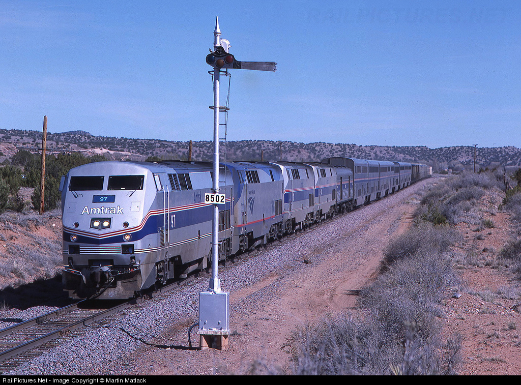 Amtrak #3, The Southwest Chief, heads west towards Albuquerque. What is interesting in this shot is the long line of mail cars trailing the passenger consist - The Chief "hauled the mail" for many years, and that is the reason for the large amount of power up front.