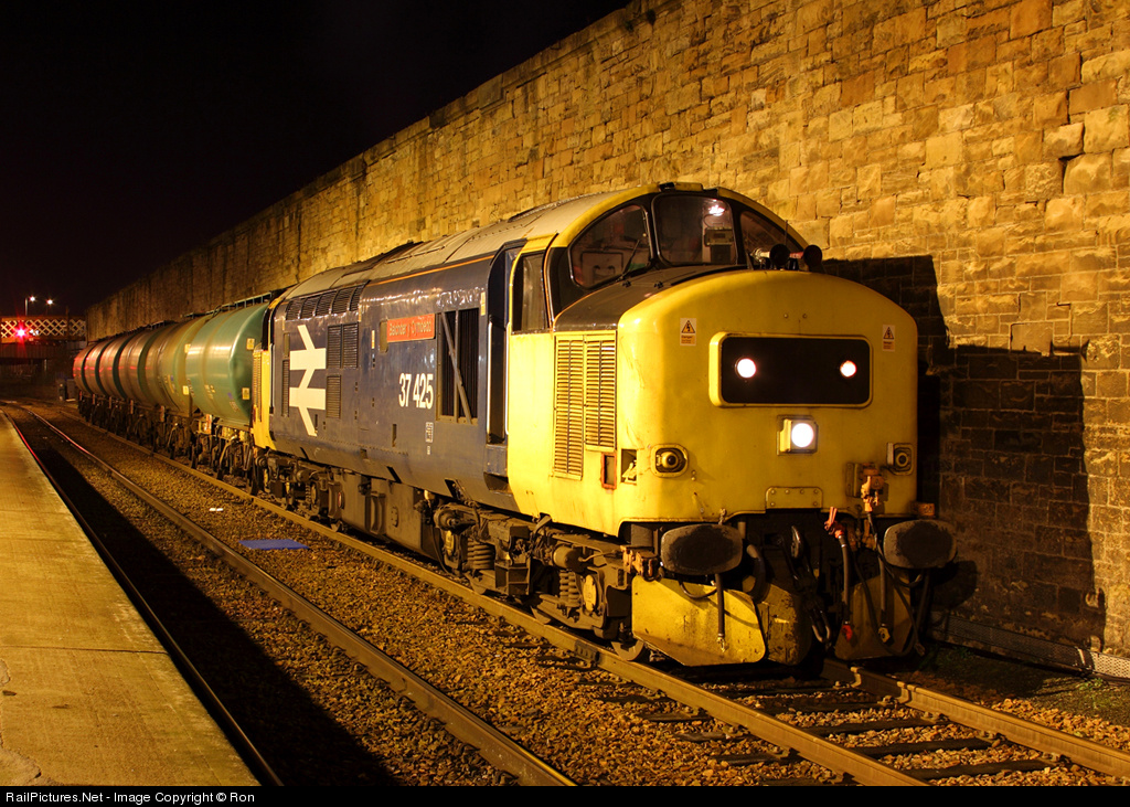 | 37425 (a 44 year old veteran of the rails) waits for a passenger train to pass at Perth while working 6D66 - the 18:39 Inverness to Mossend train, which conveys empty fuel tanks. The loco is the only one of its type currently in traffic with DB Schenker and was reinstated last month after being laid up for almost 4 years. It has returned as it is fitted with the miniature snowploughs required for a cold Scottish winter. It is painted in retro 80s British Rail 'large logo' blue colours. |