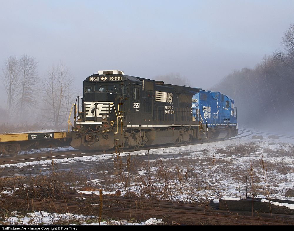| A rare lashup consisting of an NS B32-8, and an ex Conrail OLS GP38-2 are seen running around their train in Washington NJ. The sun briefly poked through the dense fog to shine some light on these two interesting locomotives. |