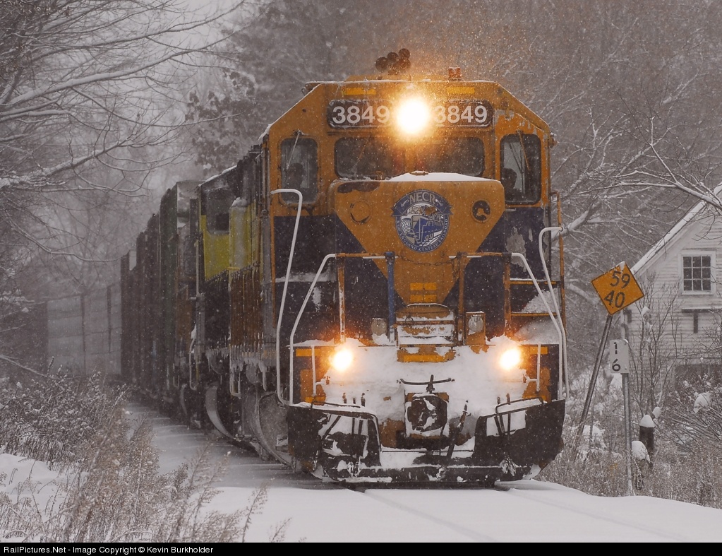 | New England Central Railroad southbound freight 324 with NECR GP38s 3849 and 3848 bracketing NYSW SD70M 4054, head south towards White River past mile 16 on the Roxbury Sub. |