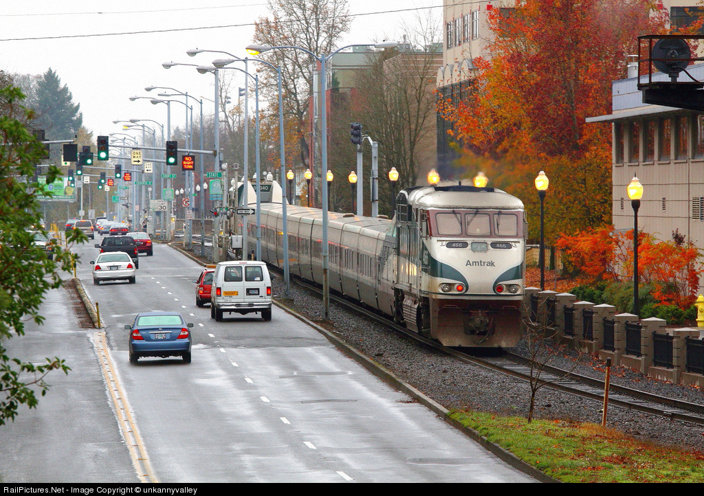 | Fittingly nestled between government buildings and government roads is the Amtrak Cascades 504. Departing northward on this cold and soggy morning along 12th Street in Salem, Oregon. This stretch of Union Pacific mainline is known for being the deadliest in the state. |