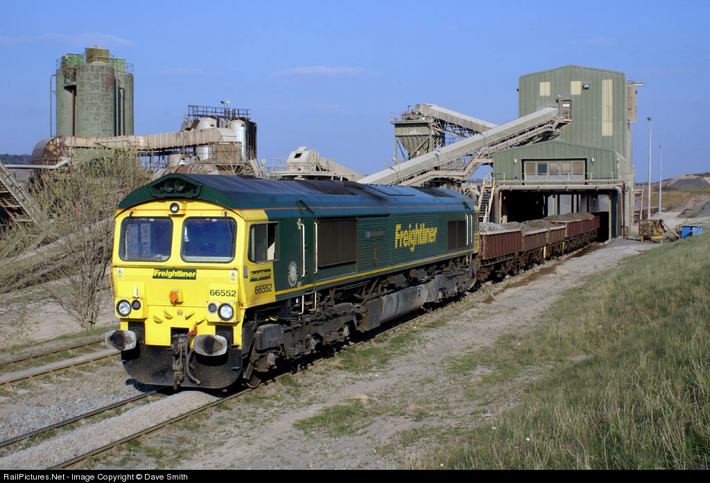 | 66552 Named "Maltby Raider" loads its train of EWS coalfish wagons with track ballast at Stud Farm quarry,this will then go forward to Forders Sidings in Bedfordshire. |