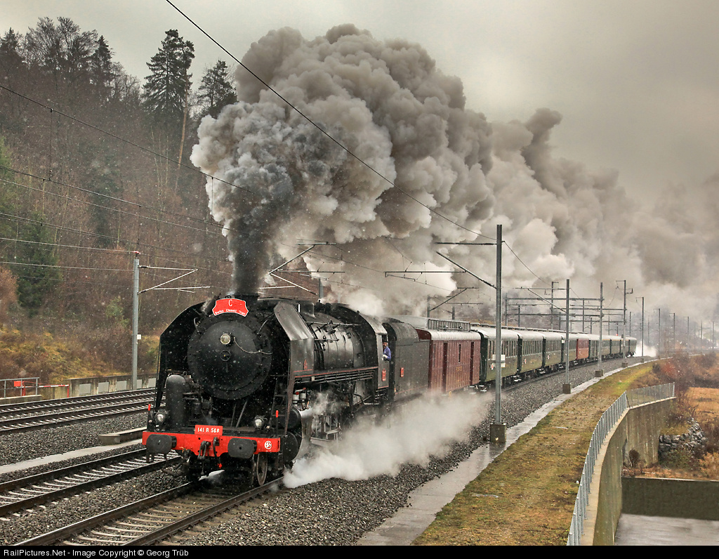 | First journey of the Baldwin built "Mikado" 141 R 568 (2-8-2, ex French Railways SNCF) with the Swiss Classic Train (SCT), both belonging to William Cook Rail, with full steam on the grade of about 1 % towards the water stop in Langenthal. |