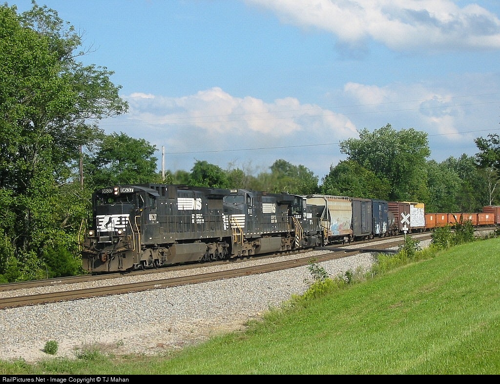 | A mixed bag of power (NS 8637, NS 9111, and NS 2391) pulls 168 up the grade westbound at Waddy! |