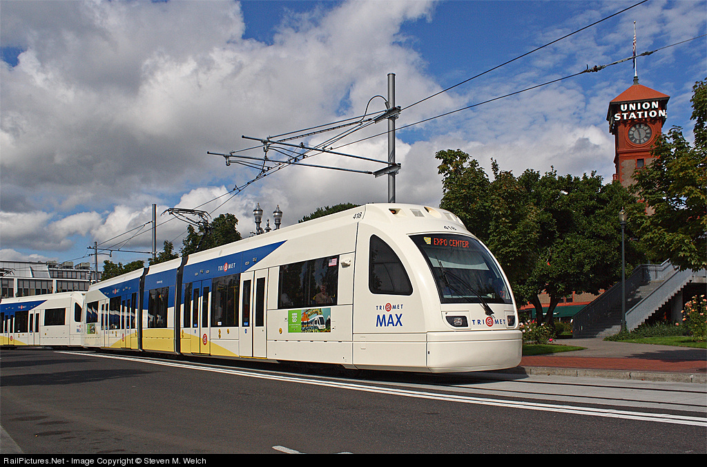 | On a cool, but beautiful September afternoon, one of the many Tri-Met MAX's rolls past Portland Union Station. |