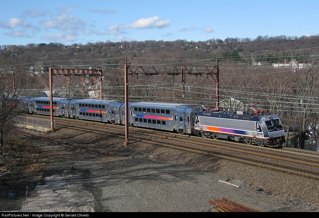 | A train of multi-level coaches heads west through the countryside at Orange on the triple-track, former DL&W Morris & Essex Lines. Note the backwards stripes on the trailing locomotive, ALP-46 no. 4601. |