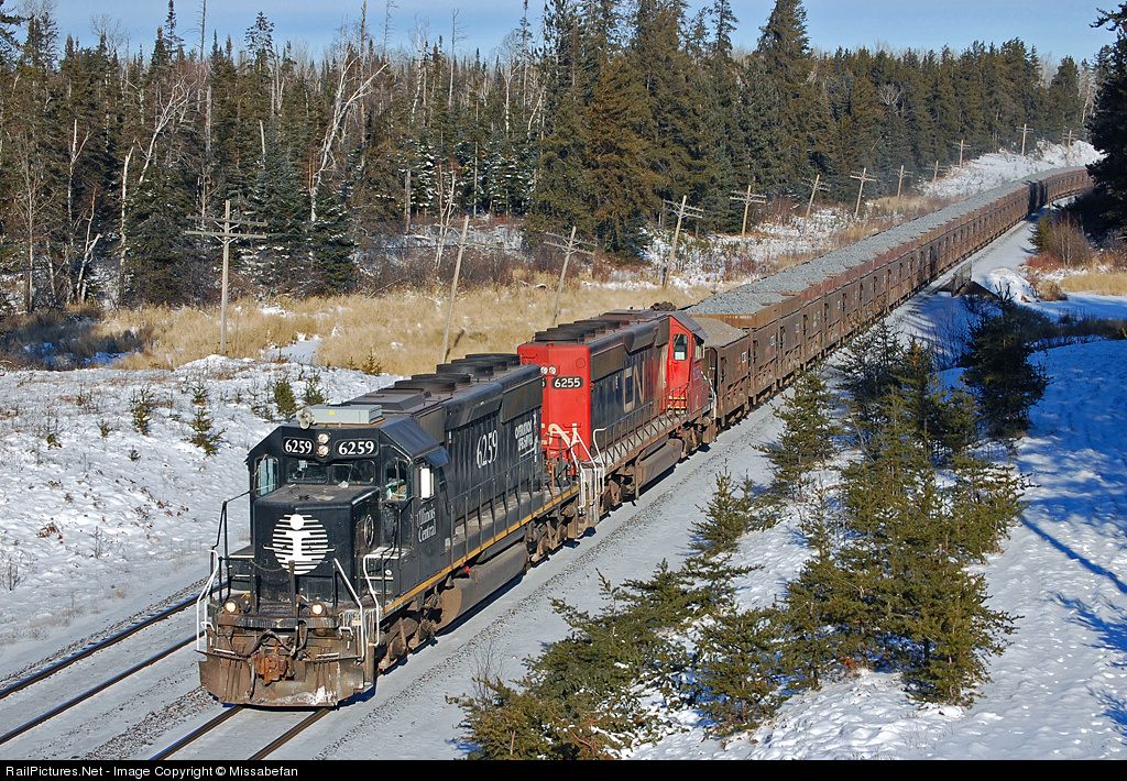 | Illinois Central 6259 and Illinois Central 6255 lead 100 loads of raw taconite southward on a cold and crisp midday run towards the processing plant. The train is the same but the look of the former Missabe is sure different. |