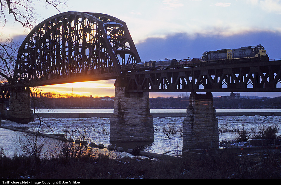 With the sun about to set CSX Y220 with its GP30 roadslug up front leads its train north across the Falls of the Ohio on a cold a frigid day.