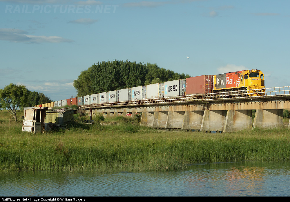 Trains on 3' 6" (1.067m) track from Whangarei to Bluff with virtually heritage rebuilt EMD and GE locomotives still the mainstay power. The network was privatized in 1990's and operated by Toll until 2008 when state owned KiwiRail was established.