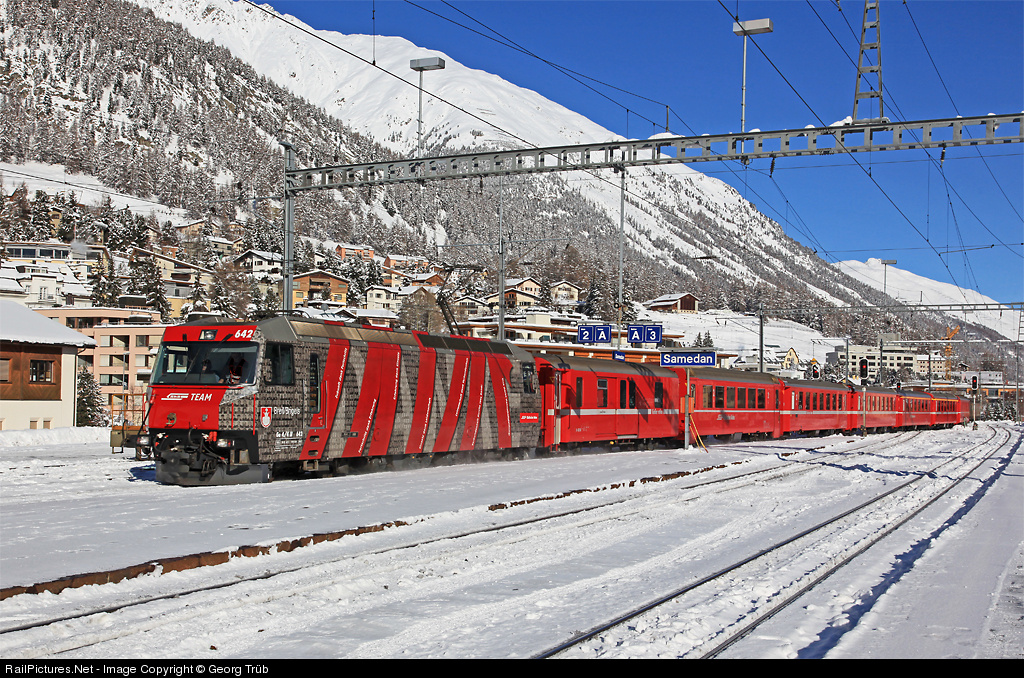 | Ge 4/4 III 642 "Team" with RE 1129 from Chur to St.Moritz is entering Samedan station. On the locomotive sides are placed pictures of all Rhaetian Railways employees. |