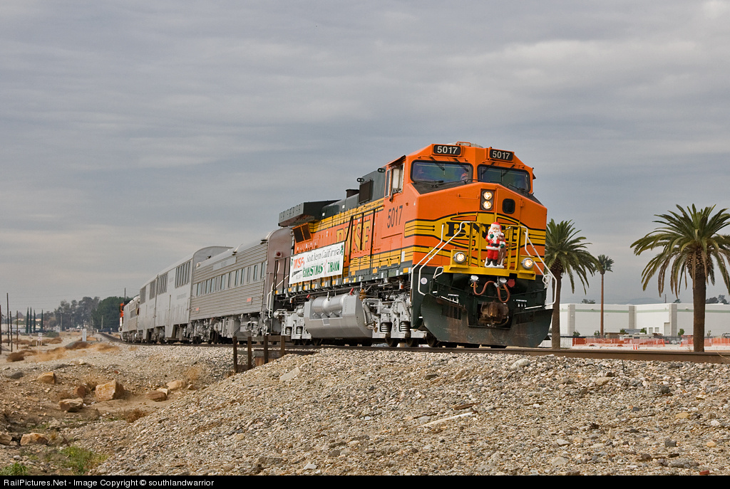 | Continuing a Santa Fe tradition, the BNSF's annual City of Hope Christmas train speeds eastbound through Rancho Cucamonga on the former Pasadena Subdivision, and in a few moments will arrive Archibald siding to allow the crew to swap ends for the return trip to Duarte. |