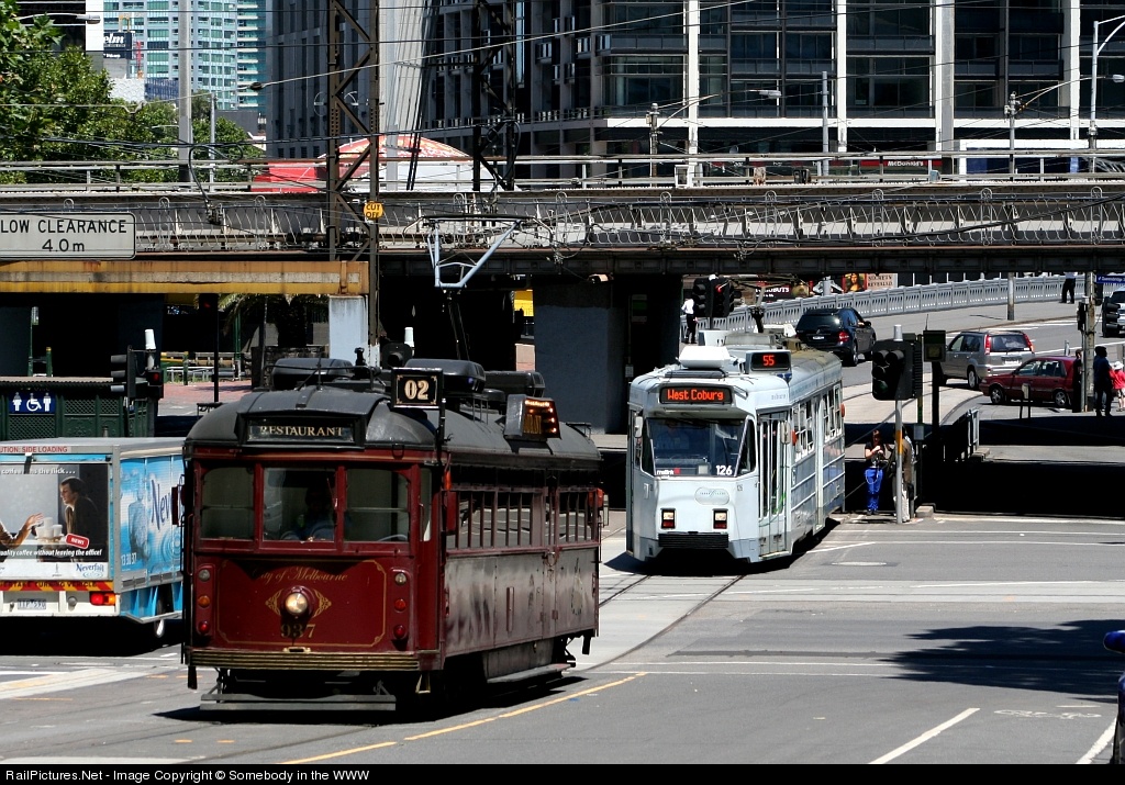 | Just happened to be in the city and spotted a restaurant tram approaching, with the following in-service tram to West Coburg on the 55 close behind. This tram even has a kitchen onboard and was full of happy diners. |