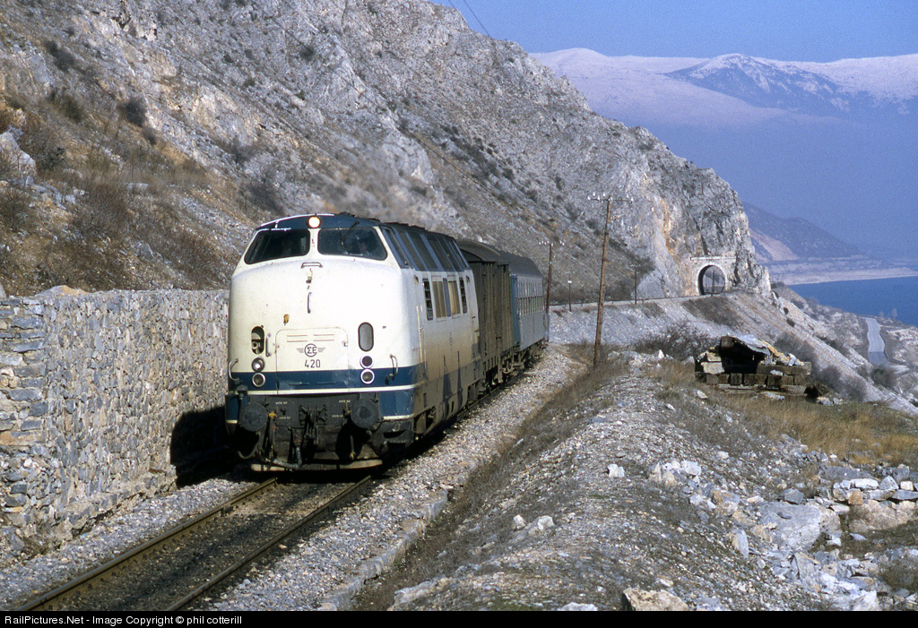| Snow in Greece may not be what you expect! Ex German 221, A-420 skirts Lake Vegoridis with the 0925 Thessaloniki to Kozani. Snow covered mountains are seen in the distance. |
