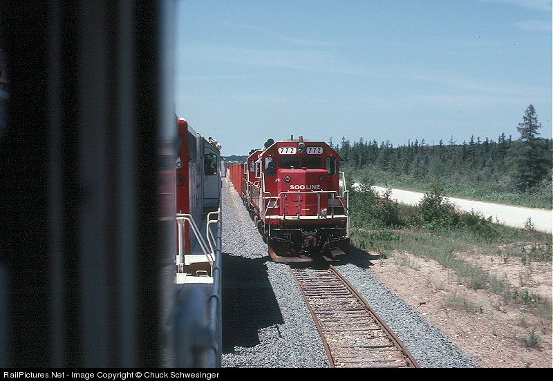 | Your riding the trailing SD40-2 following behind 759 on train #909 of July 10, 1983, rocking and rolling along at about 25mph as it meets #910 behind another pair of SD40-2's led by 772. The gray Dresser rock spread along and between the rails show Soo's ongoing attempts to upgrade the line because of expanding COFC traffic. By fall the track from Gladstone to Sault Ste. Marie was good for 40mph, but 90lbs jointed rail rolled in the 1940's just couldn't hold up for long. All of the trackwork was a moot point a couple years later when the COFC/TOFC traffic was routed away from the Upper Peninsula and over CSX between Chicago and Detroit. |