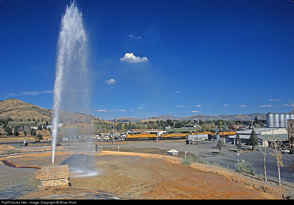A westbound Union Pacific train passes through the town of Soda Springs, ID on a warm September day. The world's only captive geyser is quite a sight to see when it erupts on the top of every hour.