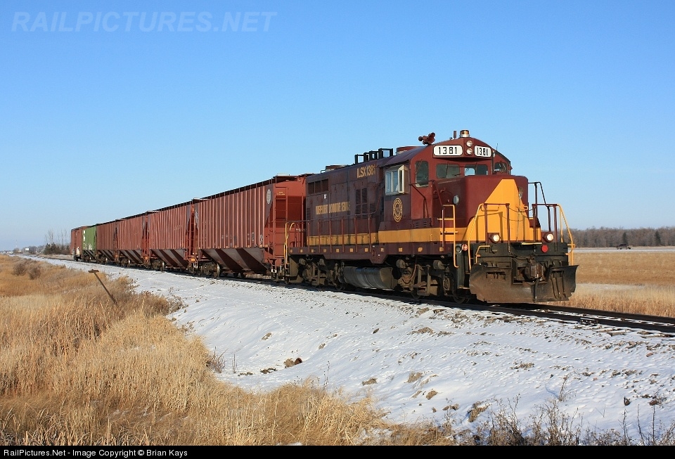 | After doing some switch work at Dakota Junction, ILSX 1381 takes six cars southbound towards Saint Hilaire traveling at 10 mph: five hoppers to CHS Northwest Grain and a lone boxcar for the St. Hilaire Seed Co. |