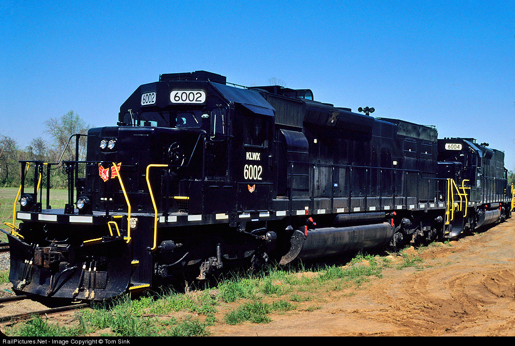 | KLWX (Knoxville Locomotive Works) SD40T-2s 6002 and 6004, both former UP/SP engines, await their next work at Donnaha, NC in May 2009. |