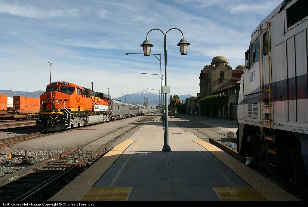 The second run of Saturday's BNSF Southern California Christmas Train waits to load at the grand restored Santa Fe station, while watched by a Metrolink F59PHI. The X-Mas train is scheduled to load at 1315 for a run up to Summit, arriving at 1400, changing ends, and returning to San Bernardino at 1515. Best comment I heard was from one of the passengers who said, "That's an old school train, man."