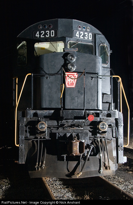 A face only a mother could love. West Chester Railroad (ex-CP Rail) Alco C424 4230 rests for the night. Thanks to Phil Banks and Brian Alesin for providing the lighting. Click here to see this engine before she was painted into her current livery.