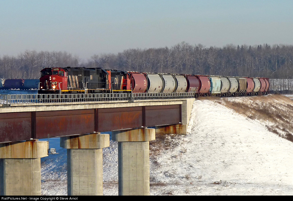 CN 5279, IC 1038, and CN 5326 cross the North Saskatchewan River with the Beamer Turn.