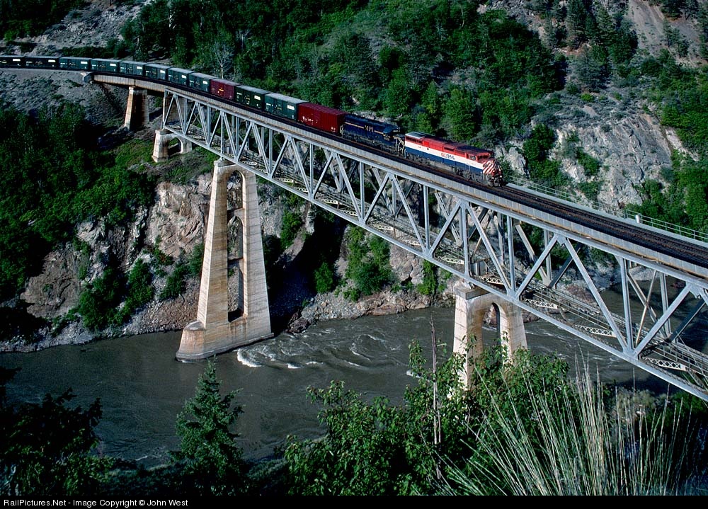 A southbound BCRail train crosses the Fraser River just north of Lillooet.