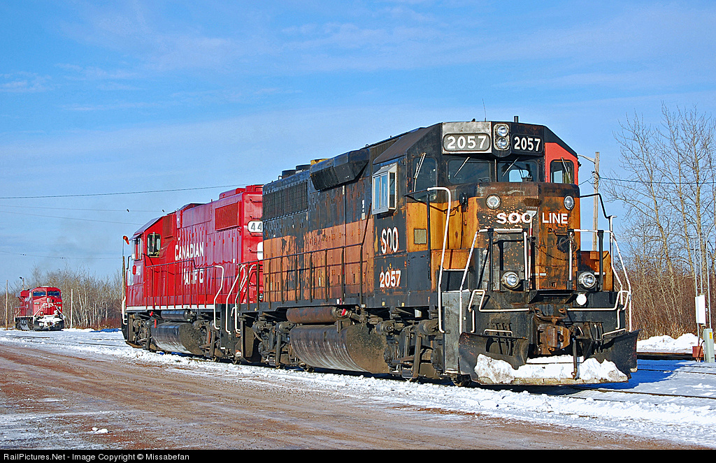 | This former Milwaukee Road unit sits tied to the colorful candy apple red CP 4403 in CP's Stinson Yard in Superior, WI on a cold late December afternoon waiting for the next assignment while some other power idles away down the line. |