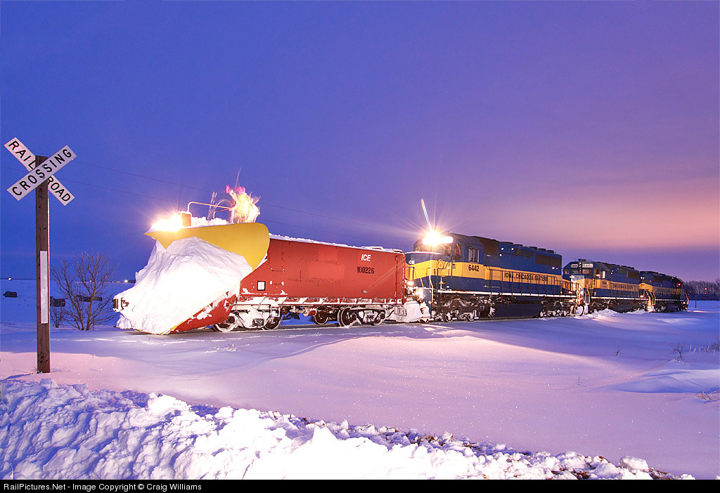 | Due to the last snow storm coming over Christmas, many lines haven't seen a train for a couple days. That means alot of the crossing are iced up and need to be worked on before running the plow thru them. Here the conductor takes advantage of the stop time at a crossing to get some of the snow off the plow so they can see better. |