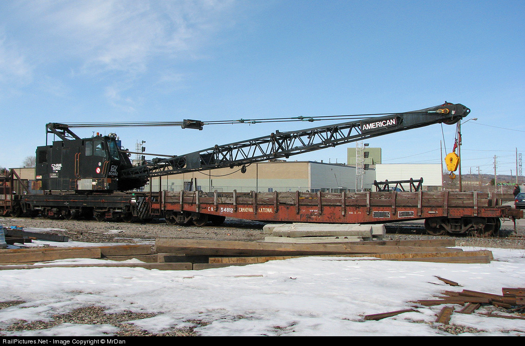 CN 50482 is a self-propelled American crane, used for Maintenance of Way applications where a small crane can come in handy (clamshell ditching, picking up tie plates with its magnet, loading rails and installing drainage pipes). It's seen resting on a weekend at Burlington West, with idler flatcar 54812.