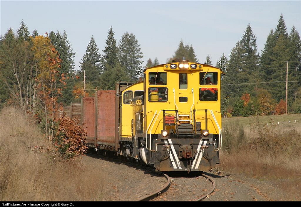 Weyerhaeuser Co. sw-1500 number 312 leads a extra freight of bulk head flat cars Through the abandoned siding of 501 pass, and is Just about to cross the South fork of the Toutle river. This train has come from the closed down mill at Green Mountain. They are taking these cars to Camp-One siding and placing them in storage there.
