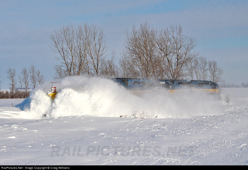 | A wedge plow blast west towards Sheldon getting the Sheldon Sub back open for business. The plow job is pasting MP 157, a few miles east of Wesley. There hasn't been hardly any drift since most of the heavy snow fell from the last storm fell west of here. Most of this Sub is 10 mph jointed rail, but where there is welded rail the train actually did plow at a nice speed. |