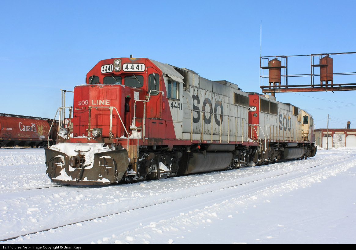 | Canadian Pacific's yard power in Thief River Falls includes SOO 4441 and one of the former stored SD60's SOO 6026. The old SOO Line Roundhouse, though only a fraction of the size it once was, appears in the background. |