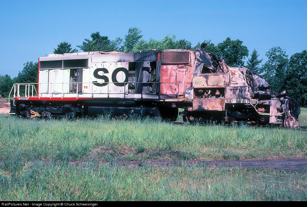 | Soo 6600 at Gilchrist after 4408 had been pulled off of her. In a few day it will be off on the long slow trip to Shoreham to be evaluated and soon enough will be determined to be beyond repair. Then it will be off to EMD as trade material for a brand new SD40-2. For a picture of 6600 a couple years earlier at this same location looking much more as EMD intended see photo #307936. |